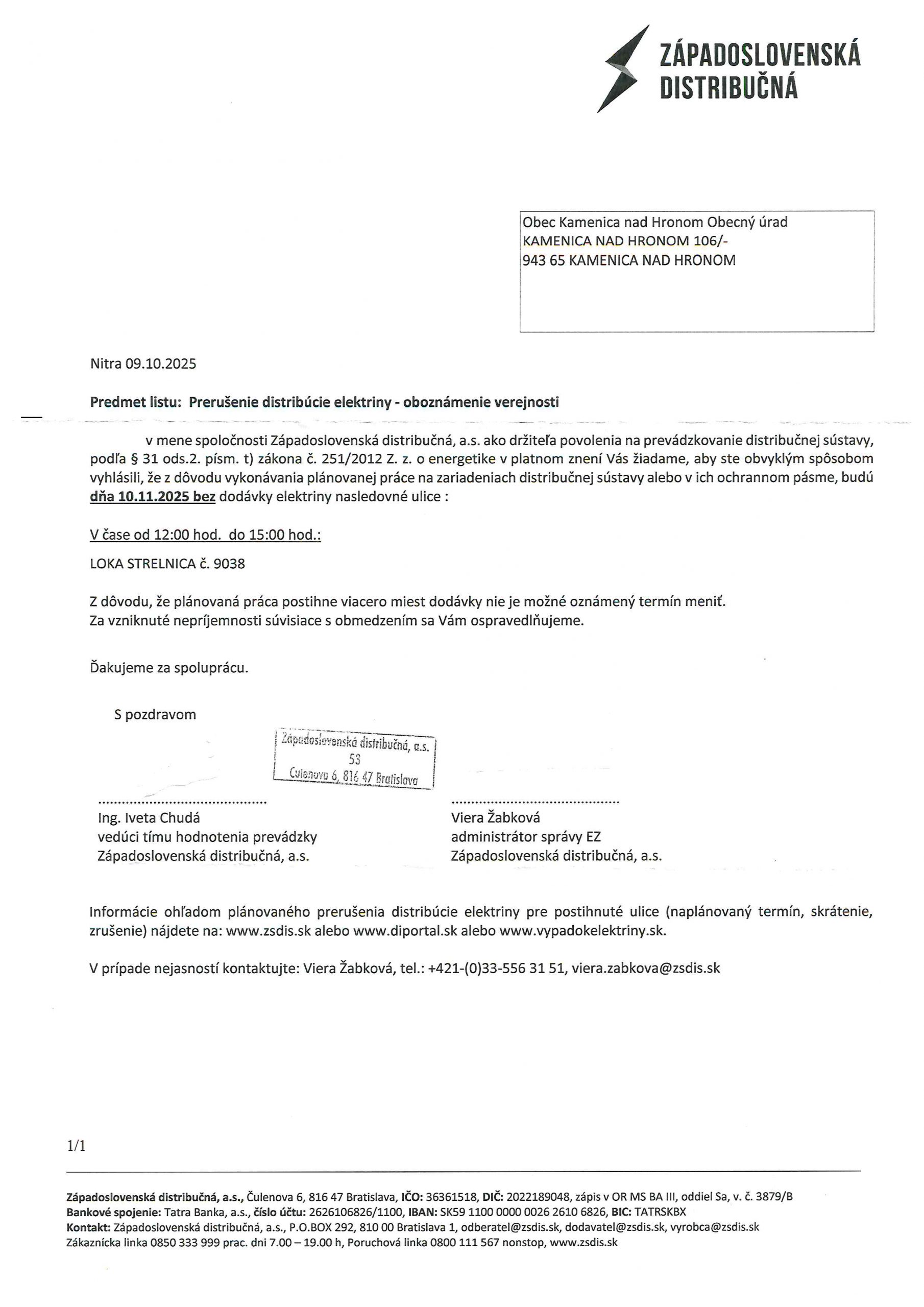 Prerušenie distribúcie elektriny – oboznámenie verejnosti