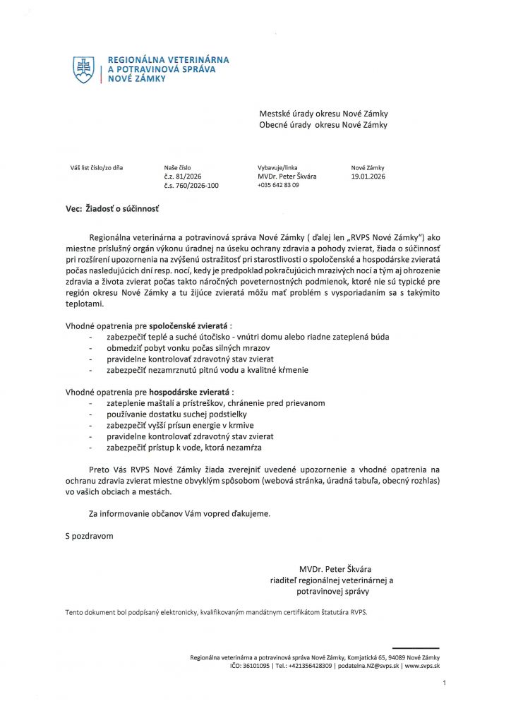 Upozornenie na zvýšenú ostražitosť pri starostlivosti o spoločenské a hospodárske zvieratá počas mrazivých nocí 21. januára 2026 v Oznámenie