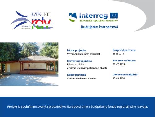 Obec Kamenica nad Hronom získala nenávratný finančný príspevok vo výške 26 531,21 Eur v rámci projektu s názvom „Vytváranie kultúrnych príležitostí“ vedené pod číslom SKHU / WETA / 1801 / 1.1-015 financovaný z Programu spolupráce Interreg V-A Slovenská republika – Maďarsko.